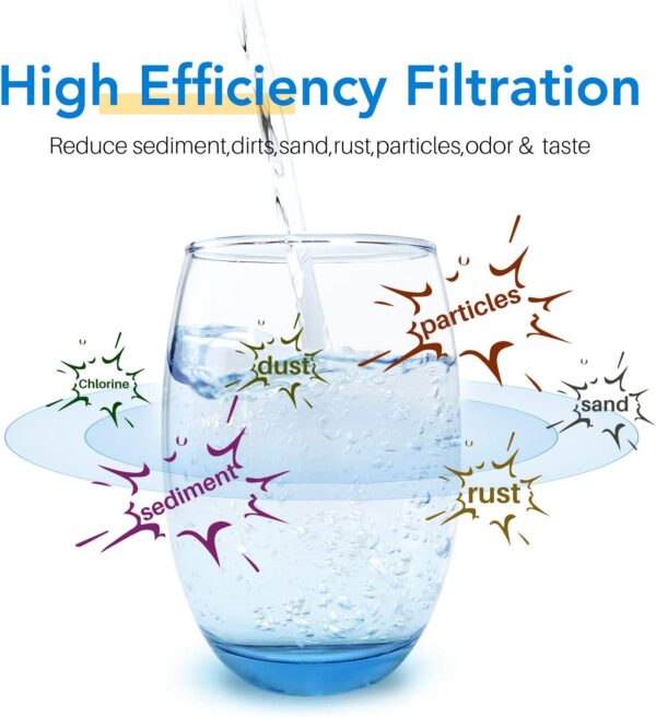 【NSF 42 CERTIFIED】Tested and certified by WQA,NSF&IAMPO against NSF/ANSI 42 to reduce 99.06% Chlorine. Reduce sand, sediments, particles,rust, color. Significantly improve the drinking water taste.